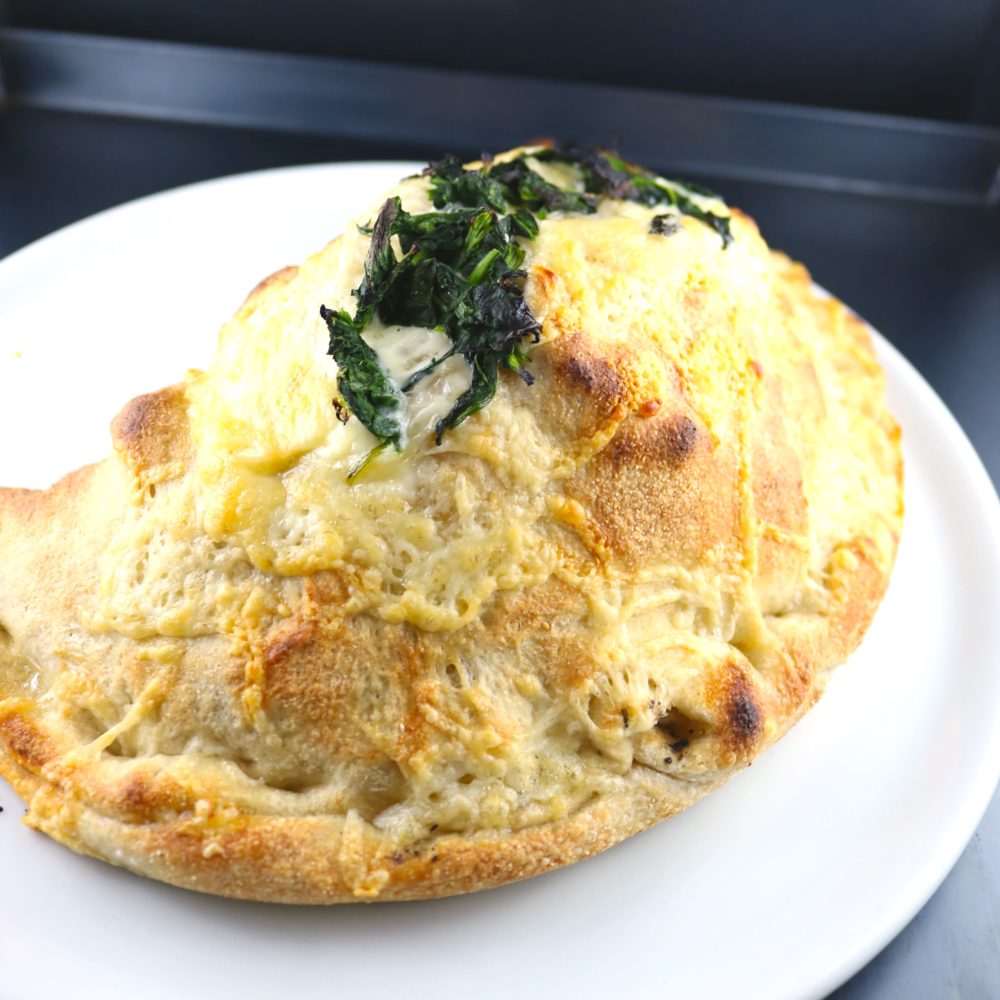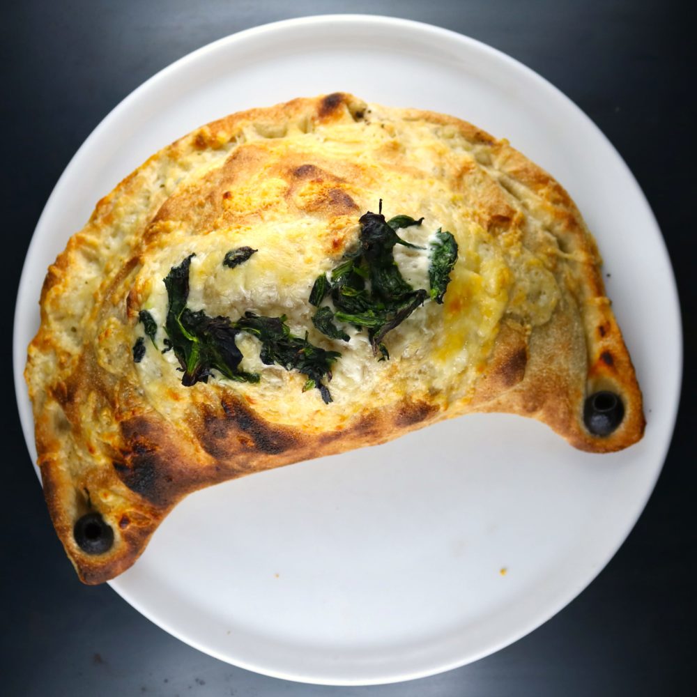 Gefüllte Pizzateigtasche mit Spinat, Hirtenkäse, Zwiebeln & frischem Knoblauch, überbacken mit Käse.