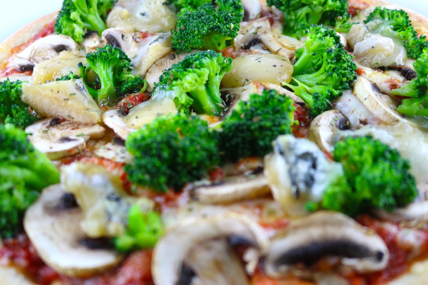 Mit Gorgonzola, Broccoli, Champignons & pikanter Tomatensauce mit herzhaftem Käse.