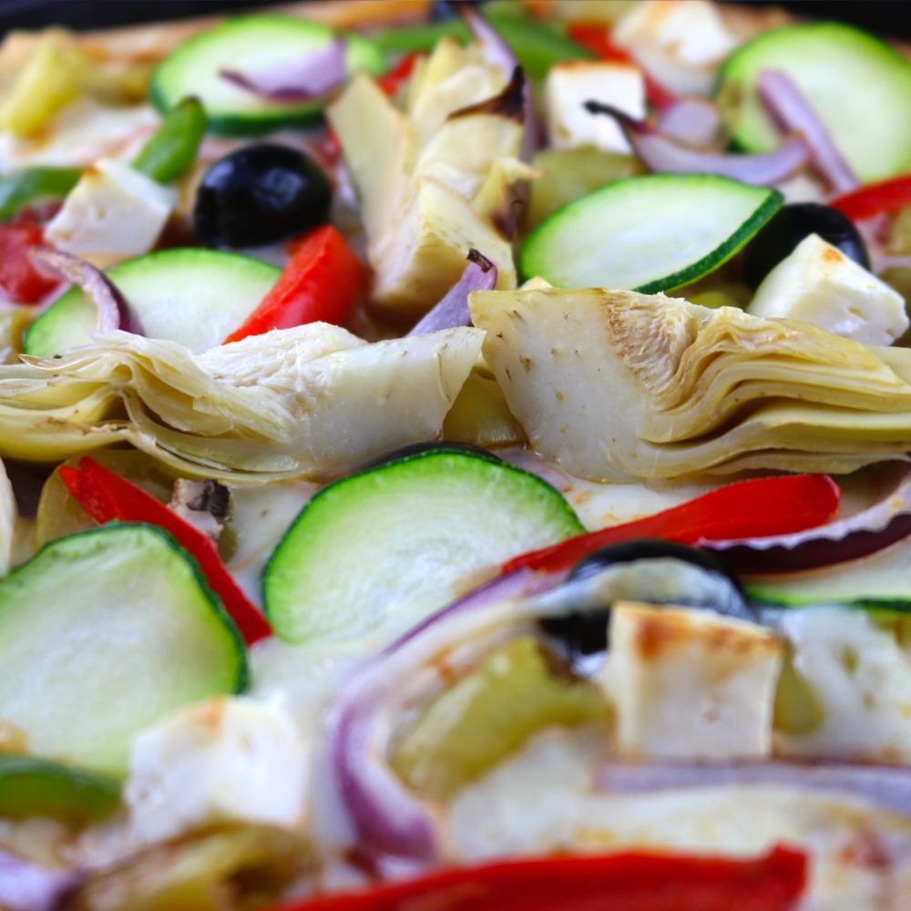 Mit Artischocken, Paprika, Zucchini, Zwiebeln, Oliven, Hirtenkäse, Peperoni mit pikanter Tomatensauce & herzhaftem Käse .