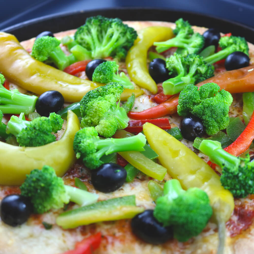 Die frische vegetarische Pizza mit Broccoli, roten & grünen Paprika,